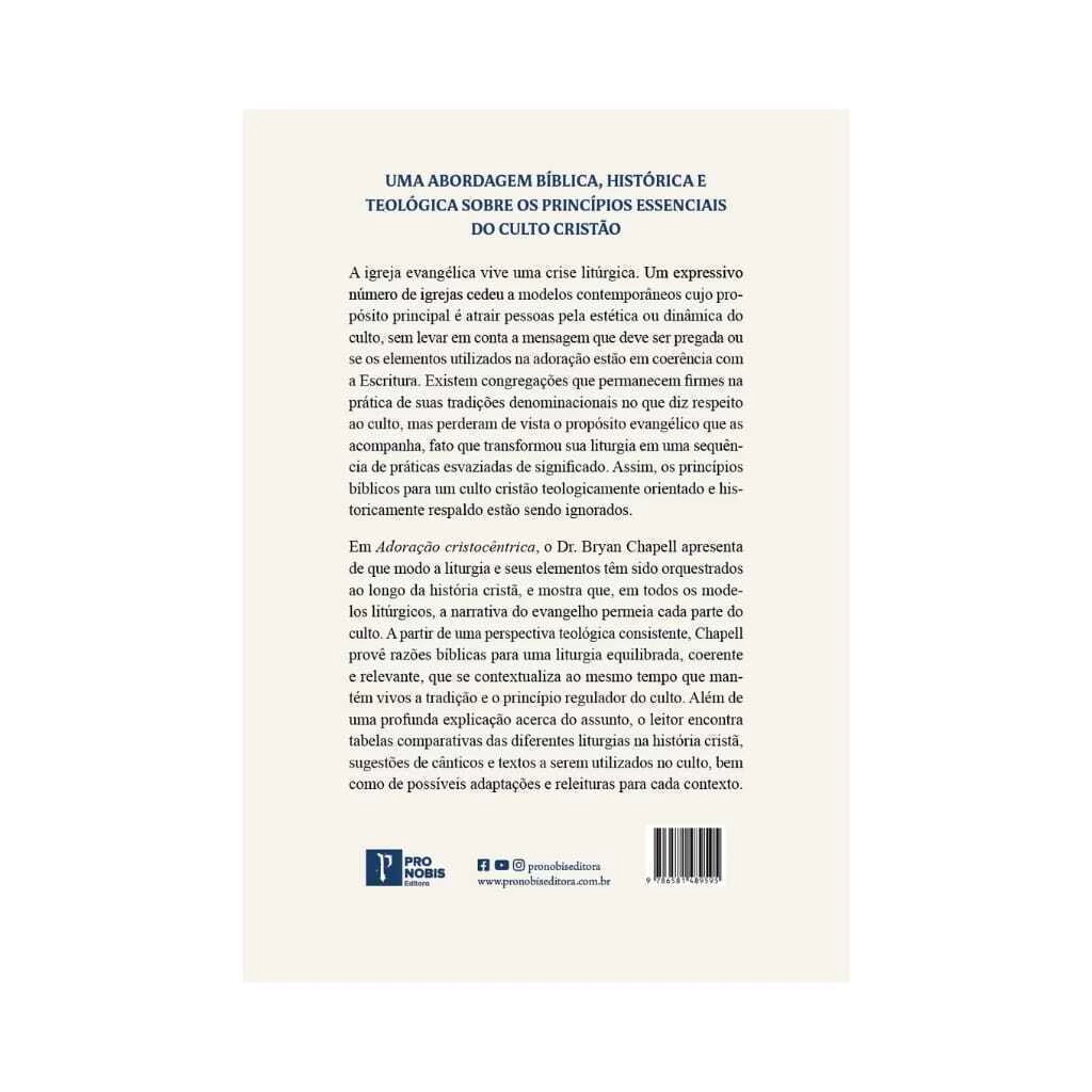 Em Adoração cristocêntrica, o Dr. Bryan Chapell apresenta de que modo a liturgia e seus elementos têm sido orquestrados ao longo da história cristã, e mostra que, em todos os modelos litúrgicos, a narrativa do evangelho permeia todas as partes do culto. A partir de uma perspectiva teológica consistente, Chapell provê razões bíblicas para uma liturgia equilibrada, coerente e relevante, que se contextualiza ao mesmo tempo que man- tém vivos a tradição e o princípio regulador do culto. Além de uma profunda explicação acerca do assunto, o leitor encontra tabelas comparativas das diferentes liturgias na história cristã, sugestões de cânticos e textos a serem utilizados no culto, bem como de adaptações possíveis para cada contexto.