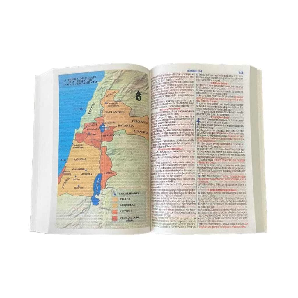 Bíblia Sagrada, com a linguagem na versão ARC (Almeida Revista e Corrigida) de João Ferreira de Almeida. Sendo a versão mais utilizada pelos evangélicos do Brasil. Com sua fidelidade traduzida dos textos originais pelo missionário português João Ferreira de Almeida. Além disso, conta com tecnologia full color: Promessas em destaque, palavras de Deus em azul e palavras de Jesus em vermelho. A Bíblia também inclui mapas coloridos, que enriquecem o entendimento geográfico e histórico dos acontecimentos bíblicos.